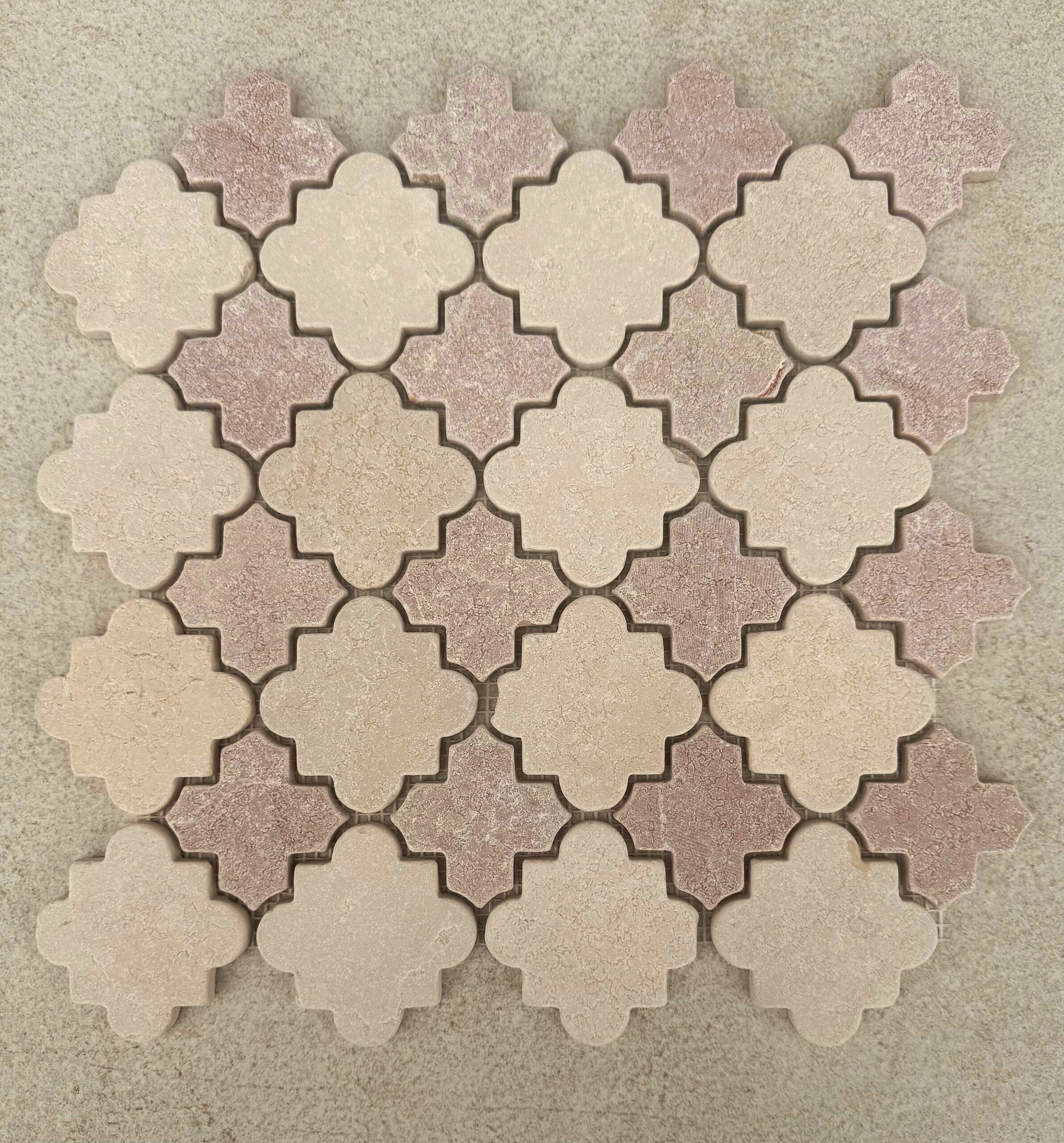 Bring a touch of elegance into your space with the beautiful Cairo natural marble mosaic that blends warm creamy beige and soft pink tiles. The tumbled finish give a soft artisanal look that will enhance many a special created space.
